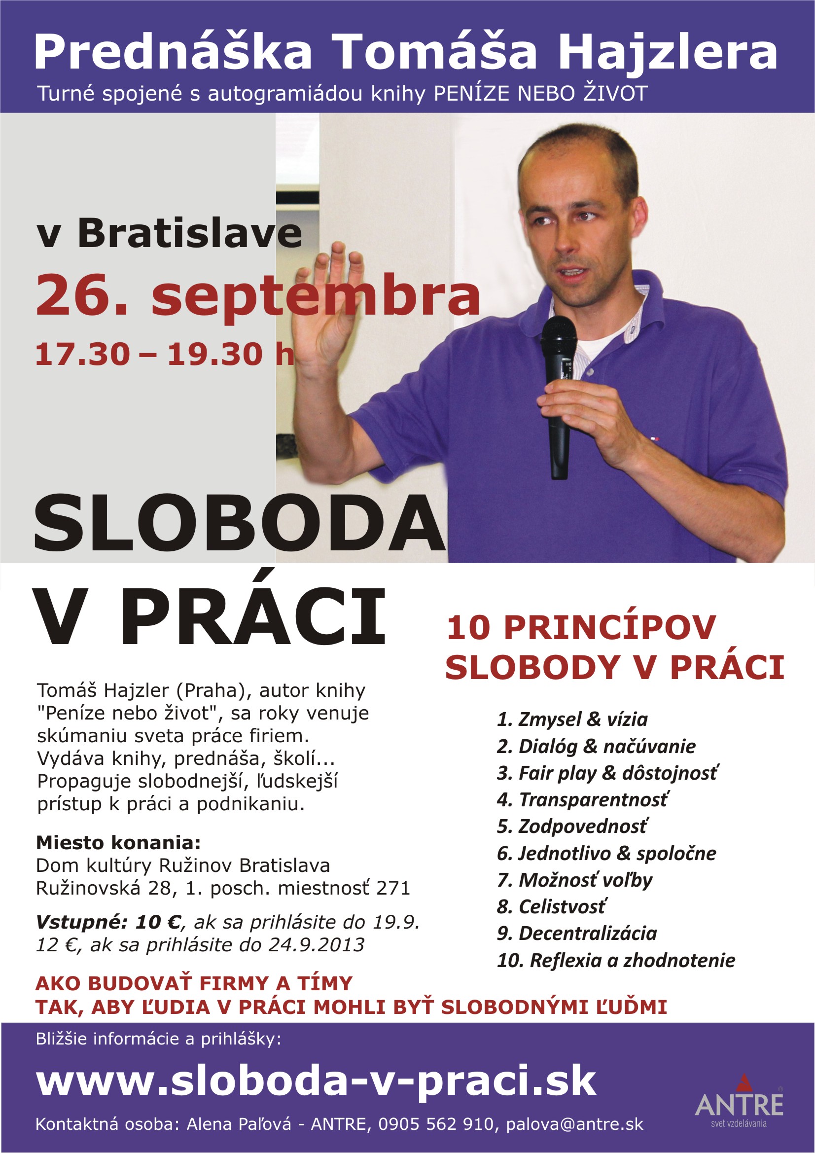 Svet (biznisu) sa zmenil k nepoznaniu. 21.storočie prežije len firma dostatočne inovatívna a flexibilná. Skutočná, udržateľná inovácia ale nie je možná bez ľudskej tvorivosti a tá zase nie je možná bez slobody. Ako teda stavať firmy a tímy tak, aby ľudia vnútri mohli byť slobodnými ľuďmi... je obsahom tejto prednášky. Viac odpovedí na otázku Prečo sloboda v práci? nájdete v článku 10 dôvodov Prečo Sloboda v práci